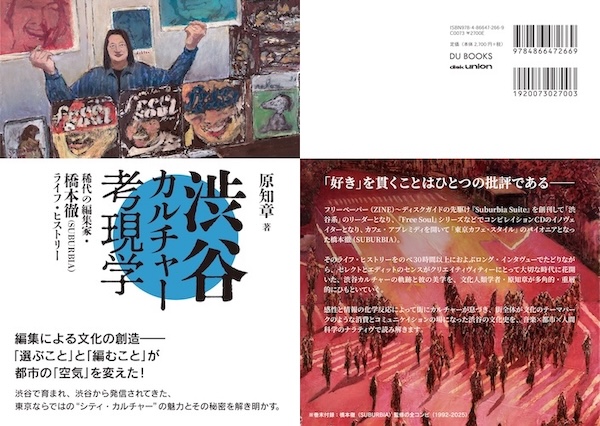 文化人類学者であり早稲田大学教授の原知章さん著の“編集による文化の創造”をテーマにした単行本『渋谷カルチャー考現学──稀代の編集家・橋本徹(SUBURBIA)ライフ・ヒストリー』が、6/9にDU BOOKSより刊行されることになり、プレス・リリースも出ましたので、ご購入予約を開始いたします。のべ30時間以上のロング・インタヴューを通して、橋本のこれまでの人生や、街全体が文化のテーマパークのように発展してきた渋谷カルチャーの軌跡とその魅力が、音楽×都市×人間科学の視点で多角的にひもとかれ、オーラル・ヒストリーとしての資料的価値も非常に高く、「好きなことを仕事に生きていくこと」へのヒントにも満ちた一冊になっています(しかも巻末付録として、橋本が1992年から2025年までに監修・選曲を手がけた全コンピ、383作のオールカラー・カタログ付き!)。A5サイズ/264ページで、装幀アートワーク〜エディトリアル・デザインもとても素敵な仕様となっており、貴重な写真も多数レイアウトされ、装画2点はいずれもFJD描き下ろしのキャンヴァス作品。アプレミディ・セレソンでお買い上げの方にはもれなく(通販含む)、①1991年7月発行『Suburbia Suite』(先着30名様)/②1991年11月発行『Suburbia Suite』(先着30名様)/③1992年4月発行『Suburbia Suite』(先着60名様)のうちいずれかをプレゼントいたしますので(メッセージ欄にご希望の号の数字をお書きください)、お見逃しなく!